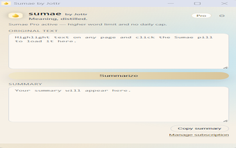 Pro версия Sumae улучшает пользовательский опыт, убирая ежедневные лимиты, позволяя вводить более длинные тексты и обеспечивая более быстрое время обработки. Его простой дизайн и функциональность гарантируют, что он может быть использован без проблем на различных онлайн-платформах. Примечательно, что Sumae не собирает личные данные, придавая приоритет конфиденциальности пользователей, обеспечивая при этом мощный инструмент резюмирования, который эффективно борется с избытком информации.